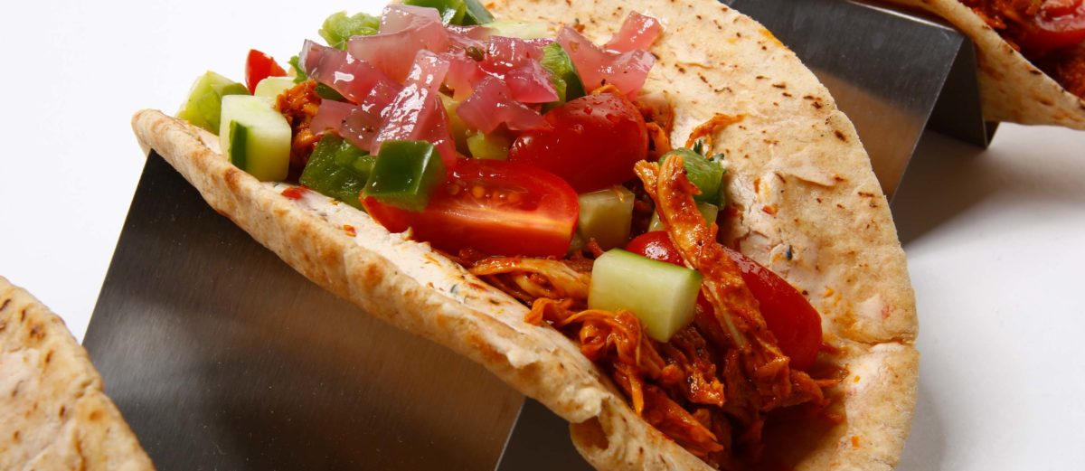 Цілий пшеничний лаваш підсмажений і наповнений солодким курячим пирігом, огірками, зеленим перцем і помідорами винограду. Гарнір з італійською петрушкою і маринованою червоною цибулею.