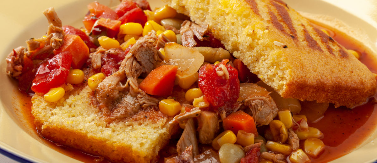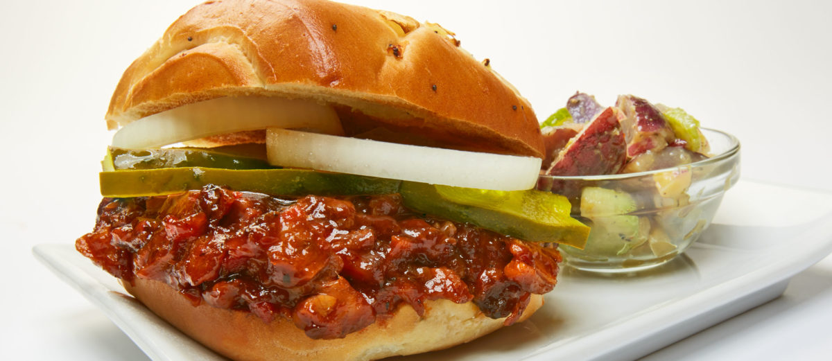 Грудинка з яловичини, увінчана соліннями з цибулі та кропу на цибулі з цибулею з гарячим гострим соусом з барбекю (оригінальна приправа для барбекю, табаско і каджун).